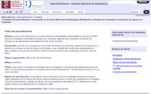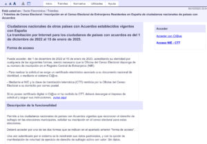 To make the application for registration online, interested parties must access the procedure “Declaration of the intention to exercise in Spain the right to active suffrage in municipal elections by voters of the CERE (Census of Foreigners Resident in Spain) nationals of countries with Agreements that recognise the right to vote in the municipal elections of May 28, 2023” of the Electronic Headquarters of the National Institute of Statistics (INE), https://sede.ine.gob.es, prove your identity through the Cl system @ve and mark the registration request option. Those who do not have a Cl@ve and have received the communication with the CTT may make the request by accessing the system with their NIE and the CTT (Consultation of the telematic processing code).